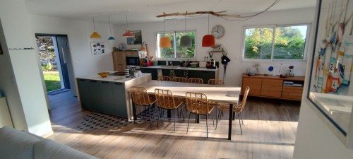 table assortie au plan de travail, bahut coordonné, luminaires choisis avec soin, accessoires astucieux, petit électro discret…